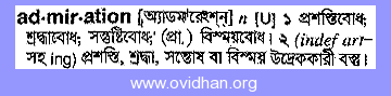 | Admiration: English to English | | Admiration (n.) Cause of admiration; something to excite wonder, or pleased surprise; a prodigy. | | Admiration (n.) Wonder mingled with approbation or delight; an emotion excited by a person or thing possessed of wonderful or high excellence; as, admiration of a beautiful woman, of a landscape, of virtue. | | Admiration (n.) Wonder; astonishment. | |