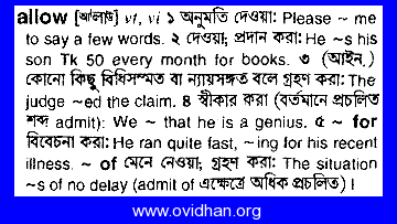 | Allow (v. t.) To grant license to; to permit; to consent to; as, to allow a son to be absent. |