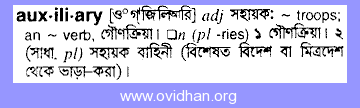| Auxiliary: English to English | | Auxiliary (a.) Conferring aid or help; helping; aiding; assisting; subsidiary; as auxiliary troops. | | Auxiliary (n.) A helper; an assistant; a confederate in some action or enterprise. | | Auxiliary (n.) Foreign troops in the service of a nation at war; (rarely in sing.), a member of the allied or subsidiary force. | | Auxiliary (sing.) A quantity introduced for the purpose of simplifying or facilitating some operation, as in equations or trigonometrical formulae. | | Auxiliary (sing.) A verb which helps to form the voices, modes, and tenses of other verbs; -- called, also, an auxiliary verb; as, have, be, may, can, do, must, shall, and will, in English; etre and avoir, in French; avere and essere, in Italian; estar and haber, in Spanis | |