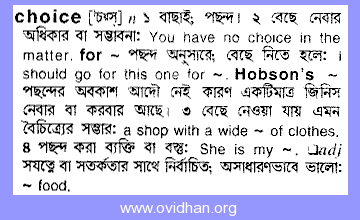 | Choice (n.) Act of choosing; the voluntary act of selecting or separating from two or more things that which is preferred; the determination of the mind in preferring one thing to another; election. |