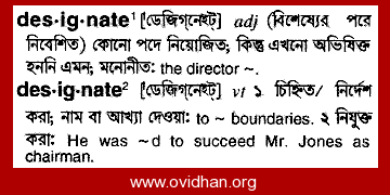 | Designate: English to English | | Designate (v. t.) Designated; appointed; chosen. | | Designate (v. t.) To call by a distinctive title; to name. | | Designate (v. t.) To indicate or set apart for a purpose or duty; -- with to or for; to designate an officer for or to the command of a post or station. | | Designate (v. t.) To mark out and make known; to point out; to name; to indicate; to show; to distinguish by marks or description; to specify; as, to designate the boundaries of a country; to designate the rioters who are to be arrested. | |