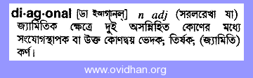 | Diagonal: English to English | | Diagonal (a.) Joining two not adjacent angles of a quadrilateral or multilateral figure; running across from corner to corner; crossing at an angle with one of the sides. | | Diagonal (n.) A diagonal cloth; a kind of cloth having diagonal stripes, ridges, or welts made in the weaving. | | Diagonal (n.) A member, in a framed structure, running obliquely across a panel. | | Diagonal (n.) A right line drawn from one angle to another not adjacent, of a figure of four or more sides, and dividing it into two parts. | |