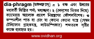 | Diaphragm: English to English | | Diaphragm (n.) A calcareous plate which divides the cavity of certain shells into two parts. | | Diaphragm (n.) A dividing membrane or thin partition, commonly with an opening through it. | | Diaphragm (n.) A partition in any compartment, for various purposes. | | Diaphragm (n.) A plate with an opening, which is generally circular, used in instruments to cut off marginal portions of a beam of light, as at the focus of a telescope. | | Diaphragm (n.) The muscular and tendinous partition separating the cavity of the chest from that of the abdomen; the midriff. | |