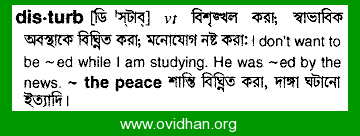 | Disturb: English to English | | Disturb (n.) Disturbance. | | Disturb (v. t.) To agitate the mind of; to deprive of tranquillity; to disquiet; to render uneasy; as, a person is disturbed by receiving an insult, or his mind is disturbed by envy. | | Disturb (v. t.) To throw into disorder or confusion; to derange; to interrupt the settled state of; to excite from a state of rest. | | Disturb (v. t.) To turn from a regular or designed course. | |