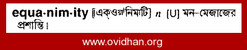 Equanimity(n.) Evenness of mind; that calm temper or firmness of mind which is not easily elated or depressed; patience; calmness; composure; as, to bear misfortunes with equanimity.