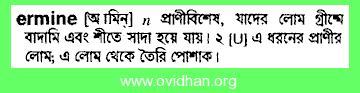 | Ermine: English to English | | Ermine (n.) A valuable fur-bearing animal of the genus Mustela (M. erminea), allied to the weasel; the stoat. It is found in the northern parts of Asia, Europe, and America. In summer it is brown, but in winter it becomes white, except the tip of the tail, which is a | | Ermine (n.) By metonymy, the office or functions of a judge, whose state robe, lined with ermine, is emblematical of purity and honor without stain. | | Ermine (n.) One of the furs. See Fur (Her.) | | Ermine (n.) The fur of the ermine, as prepared for ornamenting garments of royalty, etc., by having the tips of the tails, which are black, arranged at regular intervals throughout the white. | | Ermine (v. t.) To clothe with, or as with, ermine. | |