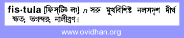 | Fistula: English to English | | Fistula (n.) A permanent abnormal opening into the soft parts with a constant discharge; a deep, narrow, chronic abscess; an abnormal opening between an internal cavity and another cavity or the surface; as, a salivary fistula; an anal fistula; a recto-vaginal fistula | | Fistula (n.) A pipe for convejing water. | | Fistula (n.) A reed; a pipe. | |