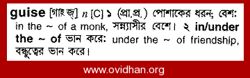 Guise(n.) Customary way of speaking or acting; custom; fashion; manner; behavior; mien; mode; practice; -- often used formerly in such phrases as: at his own guise; that is, in his own fashion, to suit himself.