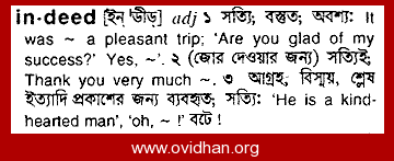 | Indeed: English to English | | Indeed (adv.) In reality; in truth; in fact; verily; truly; -- used in a variety of sense. Esp.: (a) Denoting emphasis; as, indeed it is so. (b) Denoting concession or admission; as, indeed, you are right. (c) Denoting surprise; as, indeed, is it you? Its meaning is no | |