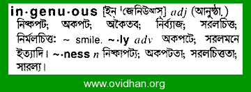 | Ingenuous: English to English | | Ingenuous (a.) Free from reserve, disguise, equivocation, or dissimulation; open; frank; as, an ingenuous man; an ingenuous declaration, confession, etc. | | Ingenuous (a.) Ingenious. | | Ingenuous (a.) Noble; generous; magnanimous; honorable; upright; high-minded; as, an ingenuous ardor or zeal. | | Ingenuous (a.) Of honorable extraction; freeborn; noble; as, ingenuous blood of birth. | |
