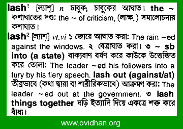 | Lash (v. i.) To ply the whip; to strike; to utter censure or sarcastic language. |