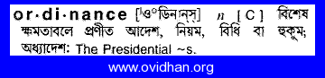 | Ordinance: English to English | | Ordinance (n.) A rule established by authority; a permanent rule of action; a statute, law, regulation, rescript, or accepted usage; an edict or decree; esp., a local law enacted by a municipal government; as, a municipal ordinance. | | Ordinance (n.) An established rite or ceremony. | | Ordinance (n.) Orderly arrangement; preparation; provision. | | Ordinance (n.) Ordnance; cannon. | | Ordinance (n.) Rank; order; station. | |