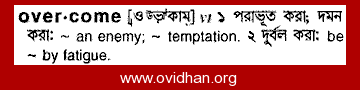| Overcome: English to English | | Overcome (p. p.) of Overcome | | Overcome (v. i.) To gain the superiority; to be victorious. | | Overcome (v. t.) To come or pass over; to spreads over. | | Overcome (v. t.) To get the better of; to surmount; to conquer; to subdue; as, to overcome enemies in battle. | | Overcome (v. t.) To overflow; to surcharge. | |