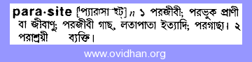 | Parasite: English to English | | Parasite (n.) A plant living on or within an animal, and supported at its expense, as many species of fungi of the genus Torrubia. | | Parasite (n.) A plant obtaining nourishment immediately from other plants to which it attaches itself, and whose juices it absorbs; -- sometimes, but erroneously, called epiphyte. | | Parasite (n.) An animal which habitually uses the nest of another, as the cowbird and the European cuckoo. | | Parasite (n.) An animal which lives during the whole or part of its existence on or in the body of some other animal, feeding upon its food, blood, or tissues, as lice, tapeworms, etc. | | Parasite (n.) An animal which steals the food of another, as the parasitic jager. | | Parasite (n.) One who frequents the tables of the rich, or who lives at another's expense, and earns his welcome by flattery; a hanger-on; a toady; a sycophant. | |