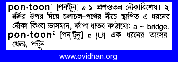 | Pontoon: English to English | | Pontoon (n.) A low, flat vessel, resembling a barge, furnished with cranes, capstans, and other machinery, used in careening ships, raising weights, drawing piles, etc., chiefly in the Mediterranean; a lighter. | | Pontoon (n.) A wooden flat-bottomed boat, a metallic cylinder, or a frame covered with canvas, India rubber, etc., forming a portable float, used in building bridges quickly for the passage of troops. | |