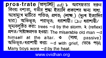 | Prostrate (v. t.) To throw down, or cause to fall in humility or adoration; to cause to bow in humble reverence; used reflexively; as, he prostrated himself. |