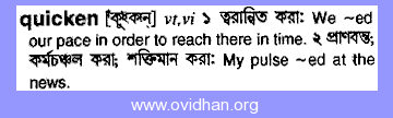 Quicken(v. i.) To move with rapidity or activity; to become accelerated; as, his pulse quickened.