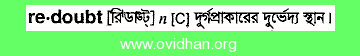 | Redoubt: English to English | | Redoubt (n.) A small, and usually a roughly constructed, fort or outwork of varying shape, commonly erected for a temporary purpose, and without flanking defenses, -- used esp. in fortifying tops of hills and passes, and positions in hostile territory. | | Redoubt (n.) In permanent works, an outwork placed within another outwork. See F and i in Illust. of Ravelin. | | Redoubt (v. t.) To stand in dread of; to regard with fear; to dread. | |