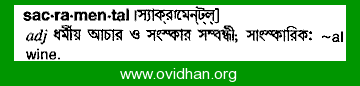 | Sacramental: English to English | | Sacramental (a.) Bound by a sacrament. | | Sacramental (a.) Of or pertaining to a sacrament or the sacraments; of the nature of a sacrament; sacredly or solemnly binding; as, sacramental rites or elements. | | Sacramental (n.) That which relates to a sacrament. | |