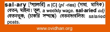 | Salary: English to English | | Salary (a.) Saline | | Salary (n.) The recompense or consideration paid, or stipulated to be paid, to a person at regular intervals for services; fixed wages, as by the year, quarter, or month; stipend; hire. | | Salary (v. t.) To pay, or agree to pay, a salary to; to attach salary to; as, to salary a clerk; to salary a position. | |