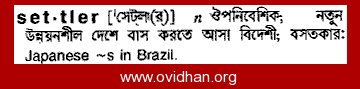 | Settler: English to English | | Settler (n.) A vessel, as a tub, in which something, as pulverized ore suspended in a liquid, is allowed to settle. | | Settler (n.) Especially, one who establishes himself in a new region or a colony; a colonist; a planter; as, the first settlers of New England. | | Settler (n.) One who settles, becomes fixed, established, etc. | | Settler (n.) That which settles or finishes; hence, a blow, etc., which settles or decides a contest. | |