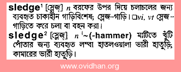 | Sledge: English to English | | Sledge (n.) A game at cards; -- called also old sledge, and all fours. | | Sledge (n.) A hurdle on which, formerly, traitors were drawn to the place of execution. | | Sledge (n.) A sleigh. | | Sledge (n.) A strong vehicle with low runners or low wheels; or one without wheels or runners, made of plank slightly turned up at one end, used for transporting loads upon the snow, ice, or bare ground; a sled. | | Sledge (v. i. & t.) To travel or convey in a sledge or sledges. | | Sledge (v. t.) A large, heavy hammer, usually wielded with both hands; -- called also sledge hammer. | |