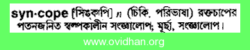 | Syncope: English to English | | Syncope (n.) A fainting, or swooning. See Fainting. | | Syncope (n.) A pause or cessation; suspension. | | Syncope (n.) An elision or retrenchment of one or more letters or syllables from the middle of a word; as, ne'er for never, ev'ry for every. | | Syncope (n.) Same as Syncopation. | |