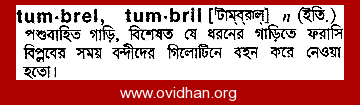 | Tumbril: English to English | | Tumbril (n.) A cart or carriage with two wheels, which accompanies troops or artillery, to convey the tools of pioneers, cartridges, and the like. | | Tumbril (n.) A cucking stool for the punishment of scolds. | | Tumbril (n.) A kind of basket or cage of osiers, willows, or the like, to hold hay and other food for sheep. | | Tumbril (n.) A rough cart. | |